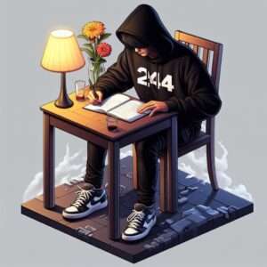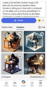 1. Create a 3d realistic illusion image a 18 year old boy wearing sneakers black hoodie is sitting on a chair with a notebook on the table and is writing something in it. There is a lamp and a flower on the table. “Subhash” is written on the boy’s hoodie.
