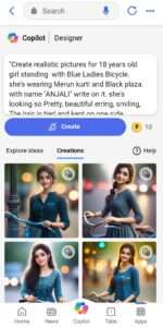 “Create realistic pictures for 18 years old girl standing with Blue Ladies Bicycle. she’s wearing Merun kurti and Black plaza. with name “ANJALI” write on it. she’s looking so Pretty, beautiful erring, smiling, The hair is tied and kept on one side shoulder, beautiful lightning blurring background, on rod, high quality picture, realistic picture, indian girl look, simple look.”