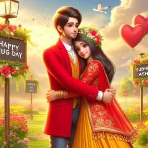 3d illustration of 20 year old couple at the beautiful garden features with flowers and lovely environment, Boy wearing red color coat, and pent and girl wearing yellow color lehenga, And background features with “Happy Hug Day at sky” , “Subhash with Asha” written at board , Real image , ultra realistic image.