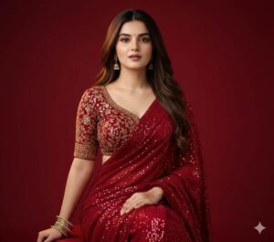 Create an 8K ultra-realistic portrait of the same Indian woman (face unchanged) wearing a deep red sequined saree with an embroidered blouse revealing her midriff and navel. Her long dark hair flows over her shoulders, paired with elegant drop earrings and delicate bangles. Against a bold red background, dramatic lighting enhances the sparkle of her attire, creating a glamorous and sophisticated aura without changing my face.