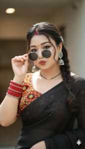 A playful and stylish close-up portrait of a young woman with long, dark hair, wearing fashionable round sunglasses and striking a pose with a puckered lip expression, looking directly at the viewer. She is wearing a simple black saree draped over a vibrant, embroidered choli (blouse) with red, yellow, and black patterns. Her accessories include a red bindi, a delicate black mangalsutra, long dangle earrings, and a stack of red bangles on her left wrist, which is held up near her face. The faceo