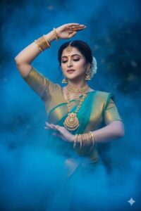 Create Close-up mesmerizing shot of a dancer adorned in intricate golden jewelry, emerging from a mystical cloud of blue smoke. Her pose is graceful and evocative, with her arms raised and eyes closed, conveying a sense of deep emotion and connection to the dance. The lighting dramatically highlights the gold accents against the smoky backdrop, creating an ethereal and captivating atmosphere. Use facial features and body figure identical as uploaded photo.