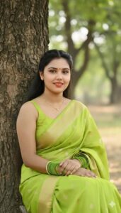A close-up, high-definition, realistic portrait of a girl with a face identical to the reference image. She is wearing a bright lime green sari draped elegantly, paired with a fitted matching blouse. The blouse has very thin straps (like ‘dhaga’). Her hair is styled in a high, heavy ponytail. She has a tiny black bindi between her eyebrows. She is sitting outdoors, leaning against a thick tree trunk. Both hands are folded gently in her lap, adorned with matching lime green full chudiya bangles.