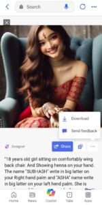 “18 years old girl sitting on comfortably wing back chair. And Showing henna on your hand. The name “Rahul” write in big latter on your Right hand palm and “khushi” name write in big latter on your laft hend palm. She is wearing wadding red lehenga,looking so Pretty, smiling, very happy, beautiful erring, realistic.”
